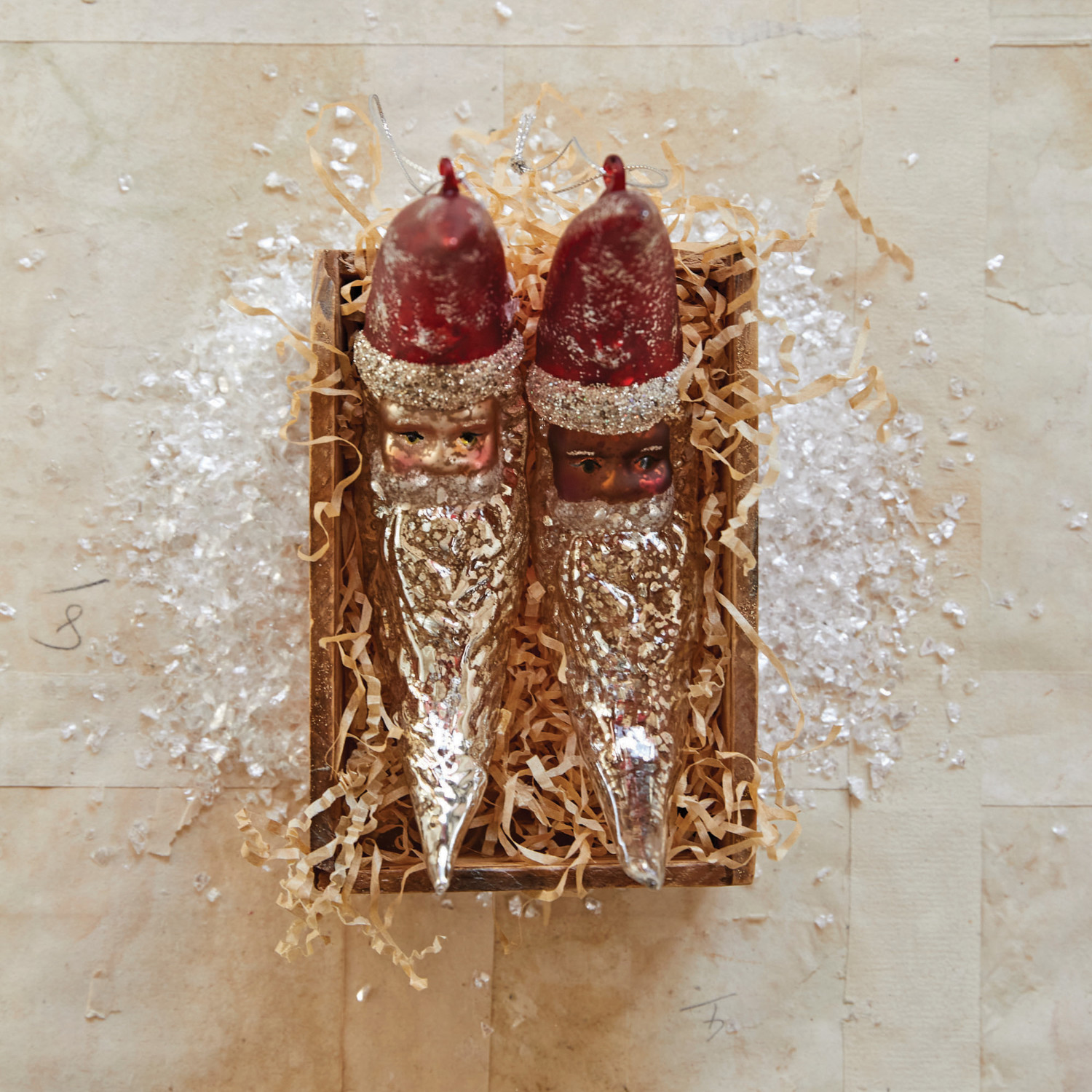 This whimsical mercury glass ornament features Santa Claus in the silhouette of a crescent moon, finished with beautifully hand-painted detail and glitter. Ornaments can be showcased as decorations on a Christmas tree, wreath, or atop a festive centerpiece, hung from doorways, displayed on mantels, used to embellish cards and presents, or given as gifts.