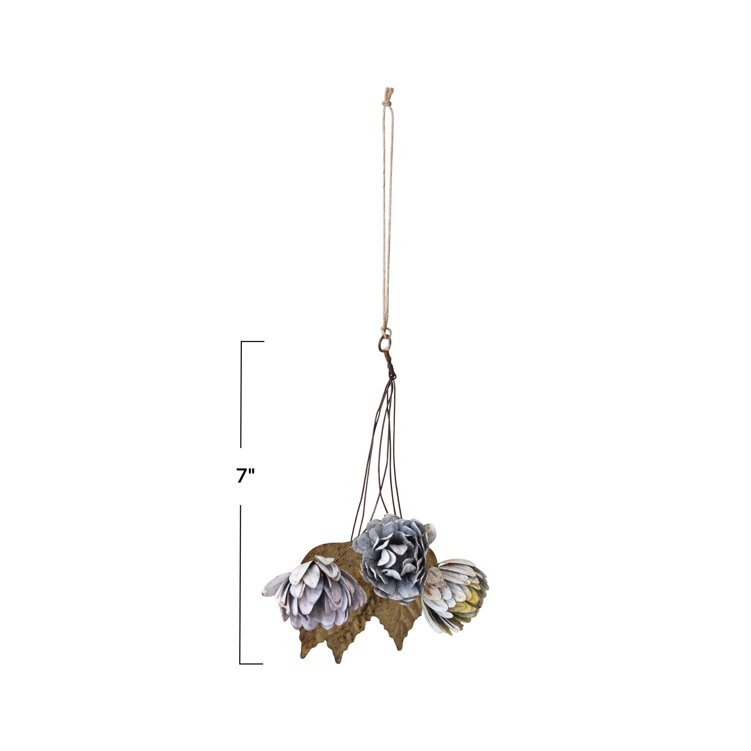 This delightful tall metal ornament features a vibrant mix of colorful leaves and flowers with a charming, distressed finish. The unique combination of colors and the distressed effect create a touch of rustic charm that complements both holiday décor and year-round home accents. Crafted from sturdy metal, this ornament is built to last. Measuring 6 inches long by 7 inches high, it's ideal for hanging on Christmas trees, wreaths, mantels, or anywhere a touch of colorful whimsy is desired. This is a perfect choice for anyone who loves graceful and elegant home decor. A delightful metal ornament featuring a vibrant mix of colorful leaves and flowers with a unique distressed finish. Adds a touch of rustic charm to any holiday décor or year-round home accents. Ideal for hanging on Christmas trees, wreaths, mantels, or anywhere a touch of colorful whimsy is desired.