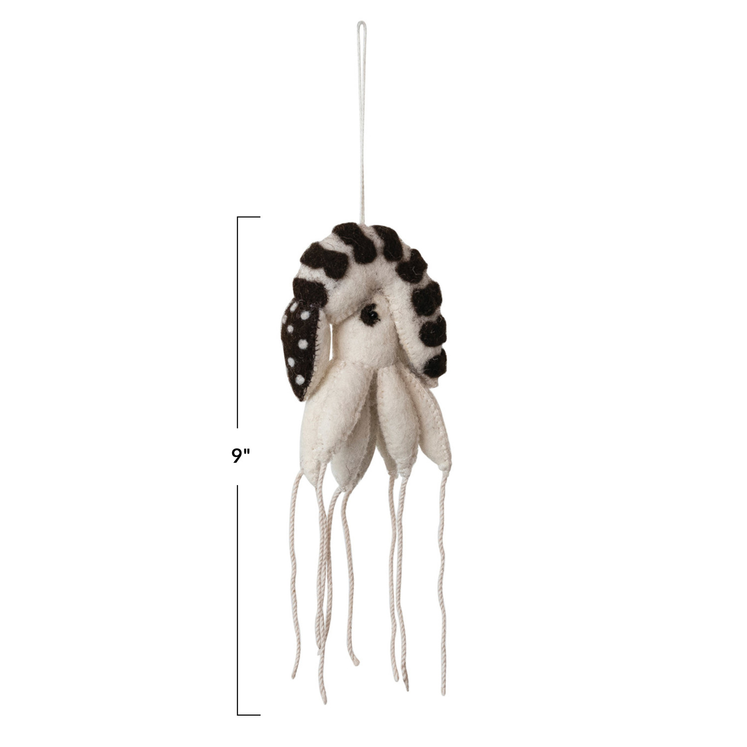 This handcrafted nautilus ornament is a testament to skilled craftsmanship with its elegant black and cream colors and precise stitching. The wool and polyester materials blend to create a soft yet durable piece that captures the essence of the nautilus's spiral elegance. Its generous dimensions ensure it stands out in any setting, inviting admiration and conversation. It measures 3.0 inches in length, 1.5 inches in width, and 9.0 inches in height, making a substantial statement on any display. Whether it's part of a festive arrangement or a permanent fixture in a nautical ensemble, this nautilus ornament is a treasure to behold. A striking piece of artistry, this black and cream nautilus ornament showcases meticulous stitching and a timeless design. An exquisite accent for any modern or traditional decor, this piece infuses a sense of the deep sea's mystery into the home. Ideal for gracing mantelpieces or as a distinguished addition to a marine-themed collection.