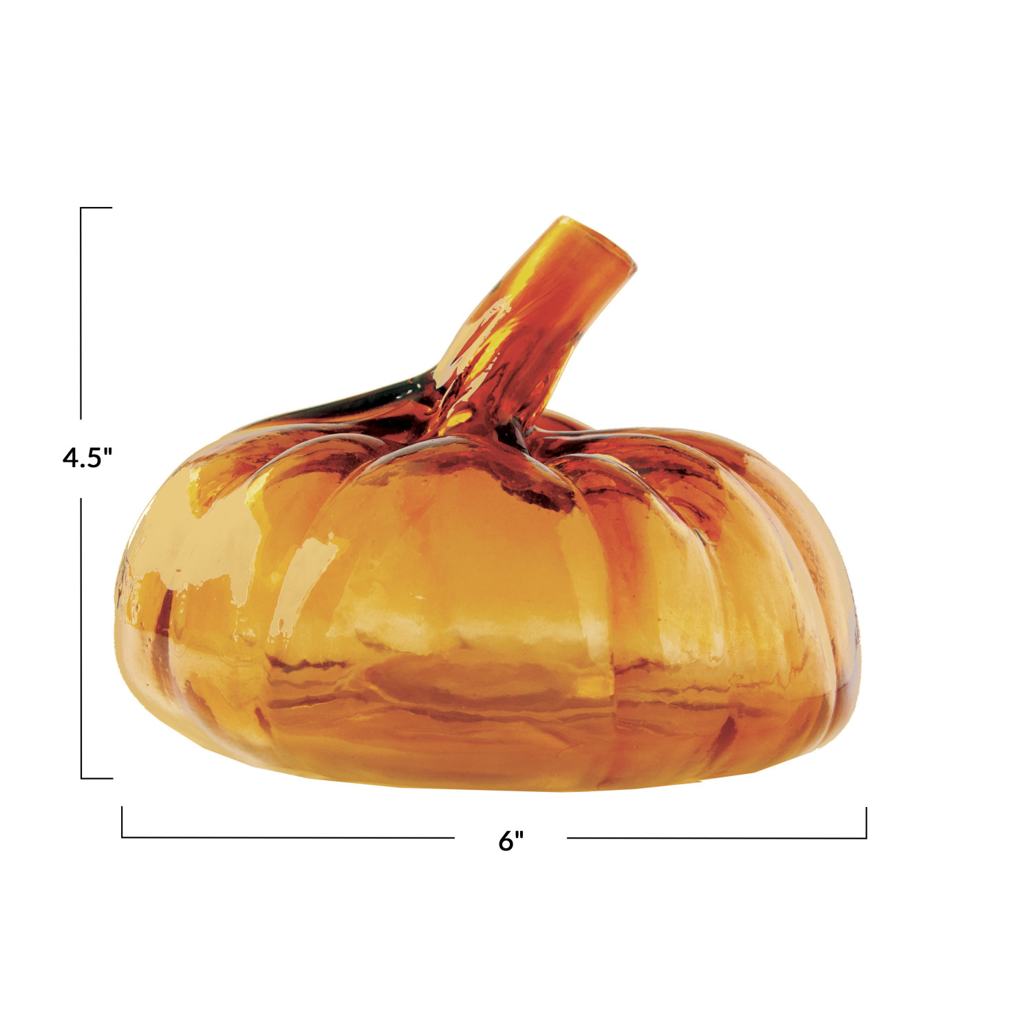 This amber glass pumpkin-shaped vase is a beautiful and convenient way to decorate the home. It features a glass vase with a pumpkin shape and an amber color that creates a warm and cozy effect, making it look like a glowing pumpkin. The vase has a smooth and glossy texture that is pleasant to touch and look at. The vase is ideal for holding flowers, candles, or other items, where it can add a touch of autumn and elegance to any space. The vase is made of glass that is clear, durable, and easy to clean, making it a great choice for home decoration. It measures 6 inches in diameter and 4.5 inches in height, making it a noticeable and attractive centerpiece. This is a perfect choice for anyone who loves stylish and versatile home decor.