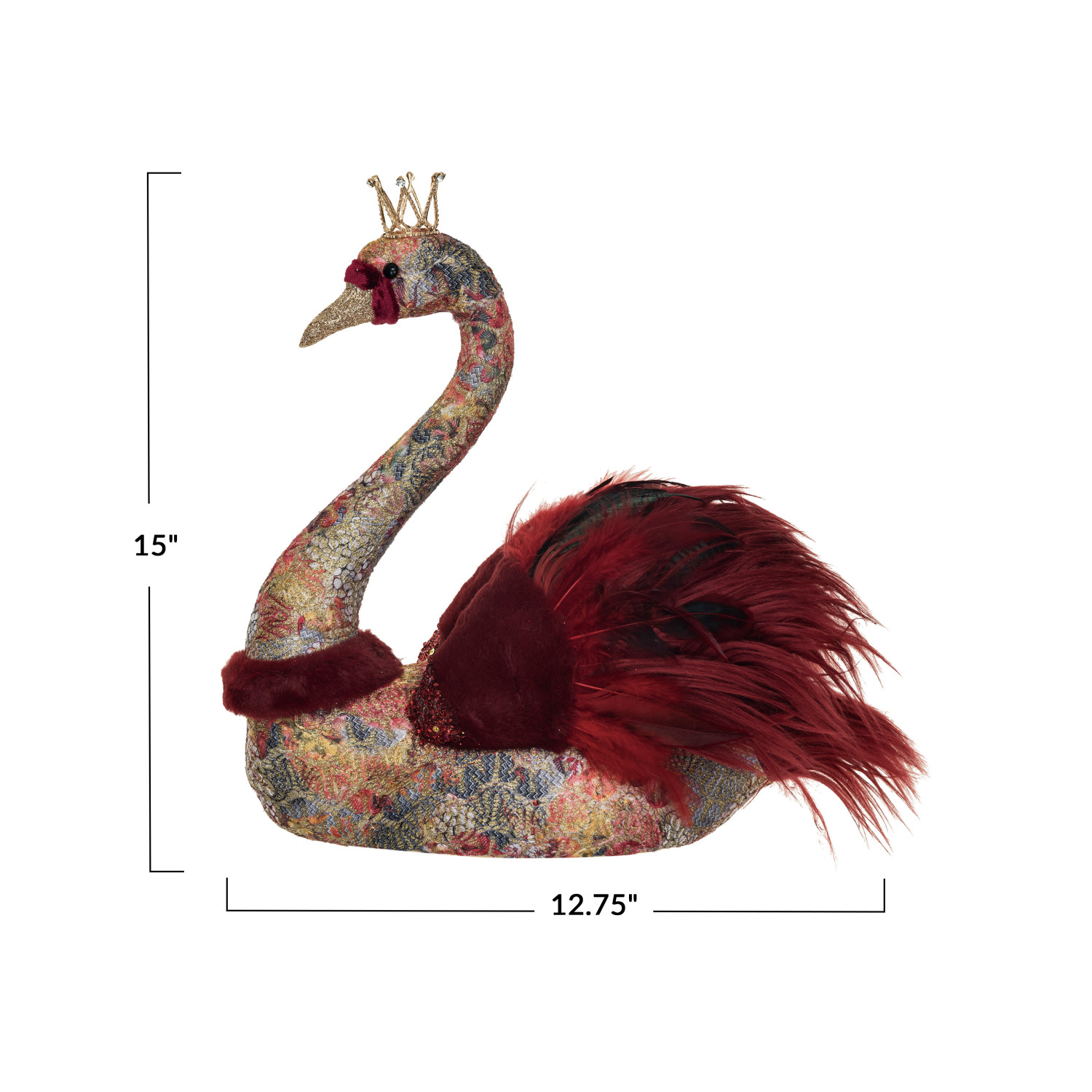 Catalog Name: 12-3/4"L x 7-1/4"W x 15"H Fabric, Foam & Feather Swan w/ Crown, Glitter & Sequins, Multi Color