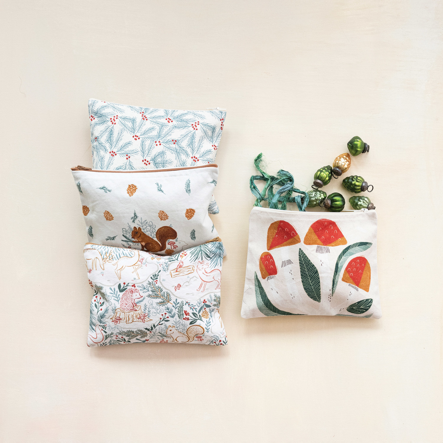 Catalog Name: 8-1/2"L x 6-1/2"H Cotton Printed Zip Pouch w/ Woodland Flora/Fauna Pattern, Multi Color, 4 Styles ©