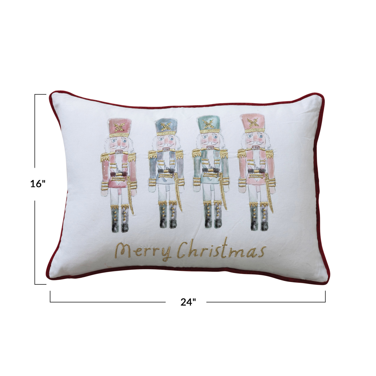 Catalog Name: 24"L x 16"H Cotton Printed Lumbar Pillow w/ Nutcrackers, Embroidery & Burgundy Velvet Piping & Back "Merry Christmas", Multi Color ©