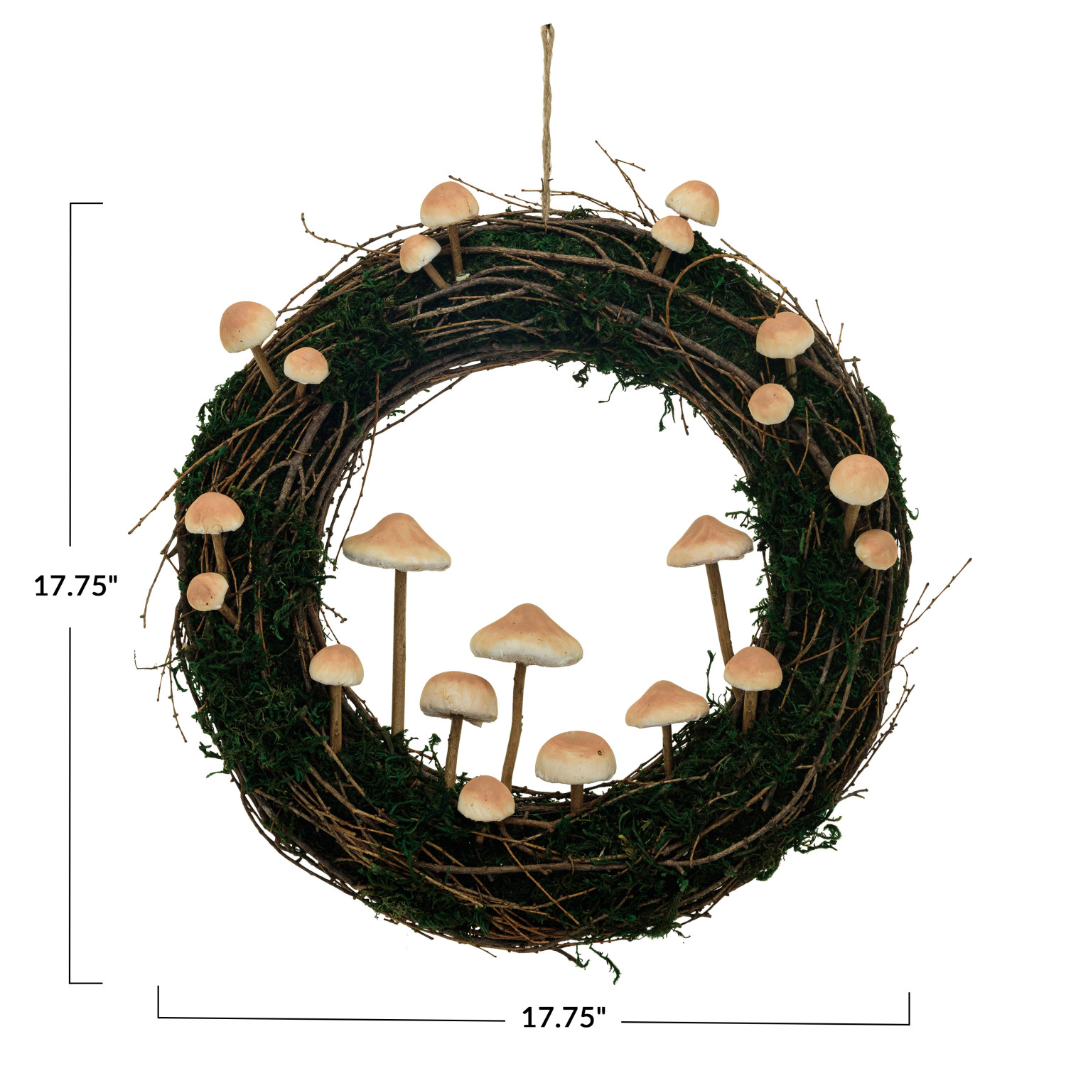 This beautiful twig and moss wreath with foam mushrooms brings the beauty of nature indoors. Handcrafted from natural twigs and moss, this wreath exudes rustic elegance with a touch of whimsy thanks to the realistic-looking foam mushrooms in natural and tan colors. Hang it on the front door to welcome guests or display it inside to add a touch of warmth and character to any room, as this wreath is sure to create a warm and inviting atmosphere. Perfect for year-round display or to add a natural element to fall décor, this versatile wreath complements a variety of styles. Measuring 17.75 inches in diameter, it creates a stunning statement. A charming 17.75-inch wreath handcrafted from natural twigs and moss for a touch of rustic elegance. Accented with realistic-looking foam mushrooms in natural and tan colors for a whimsical touch. Creates a warm and inviting atmosphere for the front door or interior spaces.