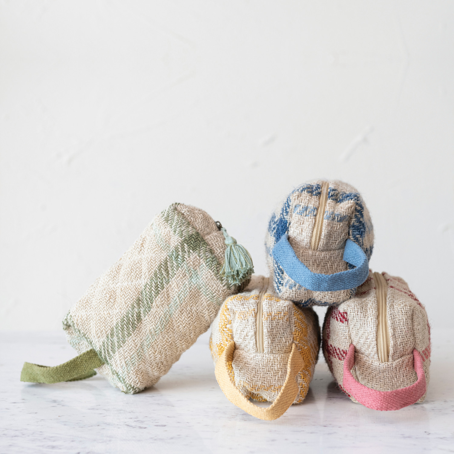 Our thoughtfully crafted collection of handbags, totes, apparel, and pouches showcases a variety of textures and hues fit for any style, function, or occasion. Explore a wide array of silhouettes for the ultimate convergence of fashion and function that include multi-functional tote bags, zippered storage pouches, reclaimed and vintage scarves and aprons, and so much more. Choose from a wide array of materials from supple velvet and sophisticated corduroy to durable canvas and woven cotton, and styles from neutral boho to maximalist glam. Streamline a daily routine, add a sustainable touch to shopping trips, or give the perfect gift for a holiday or birthday with a handbag, tote, or pouch. This charming set of quilted jute pouches features a classic plaid print in 4 vibrant hues, handles, and tassels. Display in a living space of any style from farmhouse to cottage. Spot Clean Only. Made from jute and cotton.