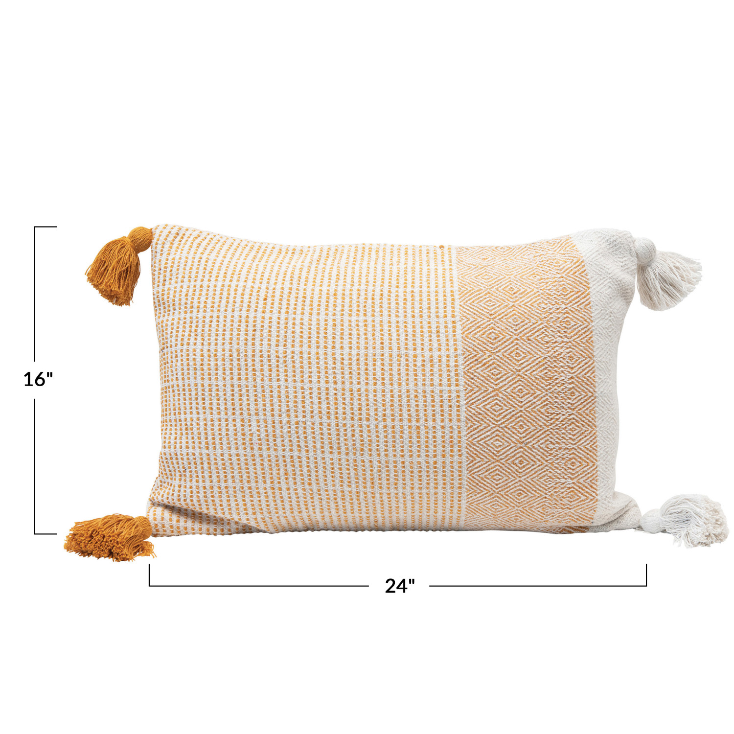 Catalog Name: 24"L x 16"H Woven Recycled Cotton Blend Lumbar Pillow w/ Tassels, Yellow & Cream Color