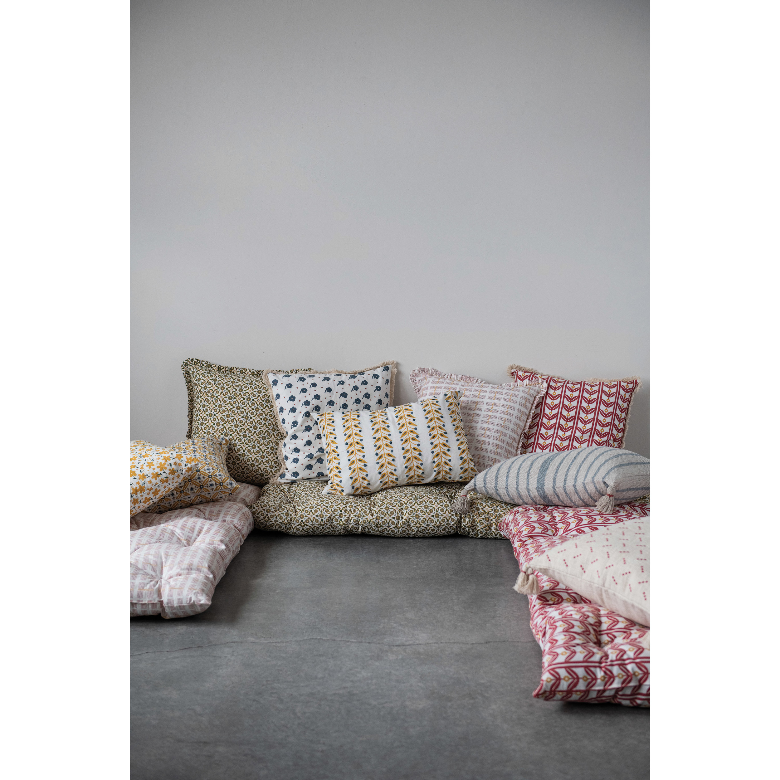 These cotton pillows instantly upgrade any couch or chair, and catches the eye effortlessly with their soft cotton construction and ruffled edges. Constructed of a removable cotton cover, for easy cleaning, with a filling made entirely of polyester. Measures 20" L x 20" W x 2" H.