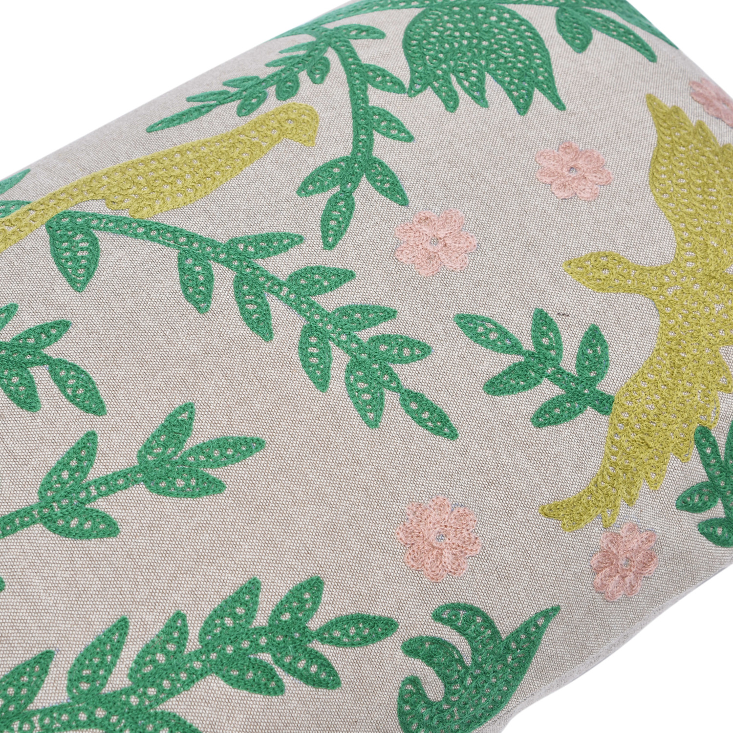 This whimsical lumbar pillow showcases durable cotton chambray, intricately embroidered with a bird and branch design. Multicolor cotton chambray lumbar pillow with bird and branch embroidery. Express your constantly evolving style with the simple addition of this eye-catching pillow. Cotton throw pillow; Spot clean only.
