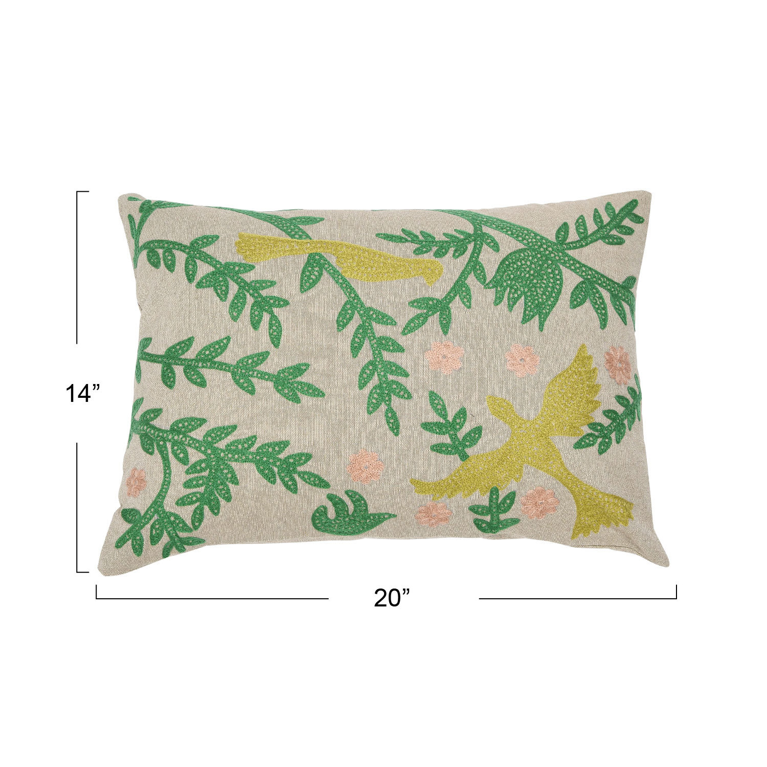 Catalog Name: 20"L x 14"H Cotton Chambray Lumbar Pillow w/ Bird Embroidery, Multi Color