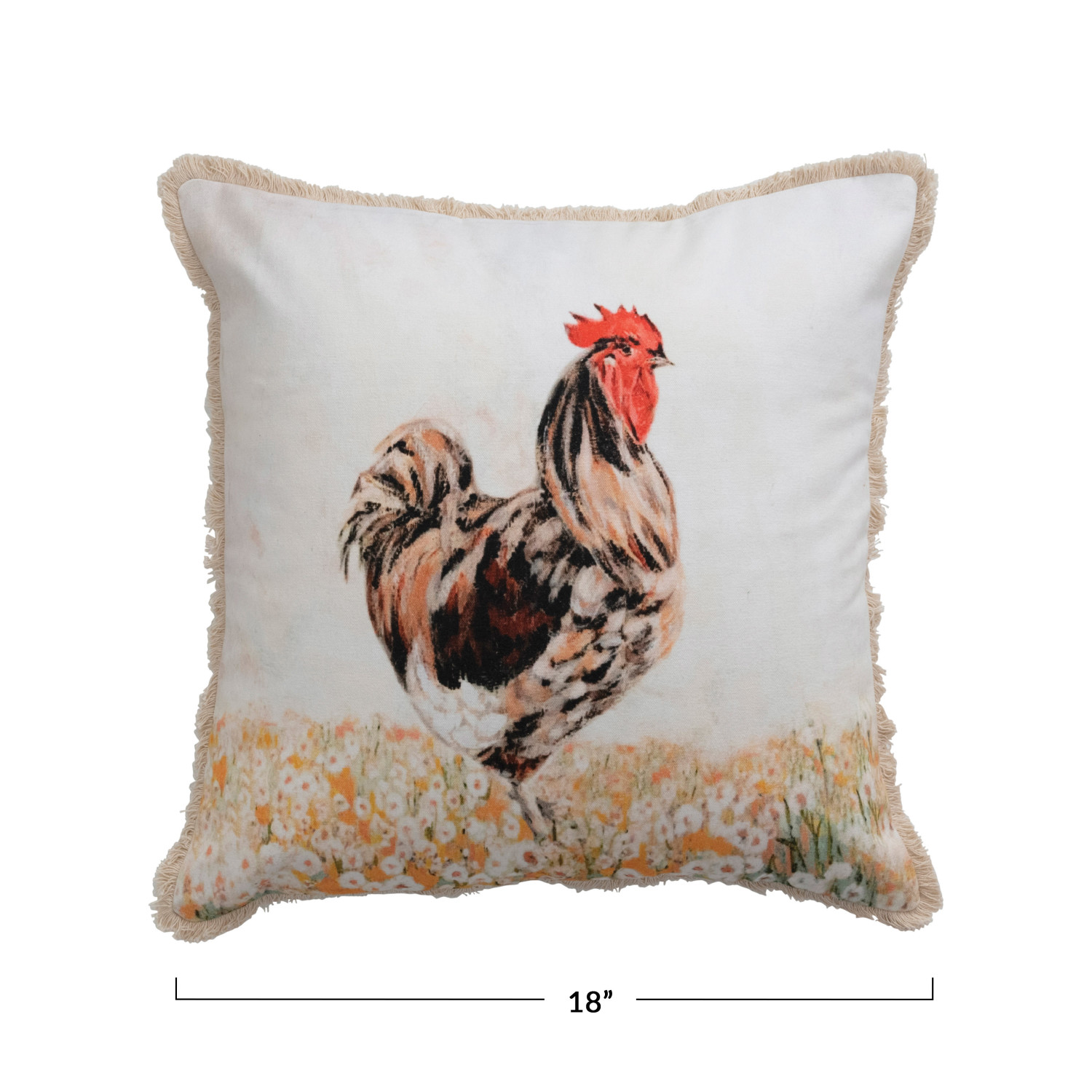 18" Cotton Pillow w/ Rooster & Eyelash Fringe, Polyester Fill