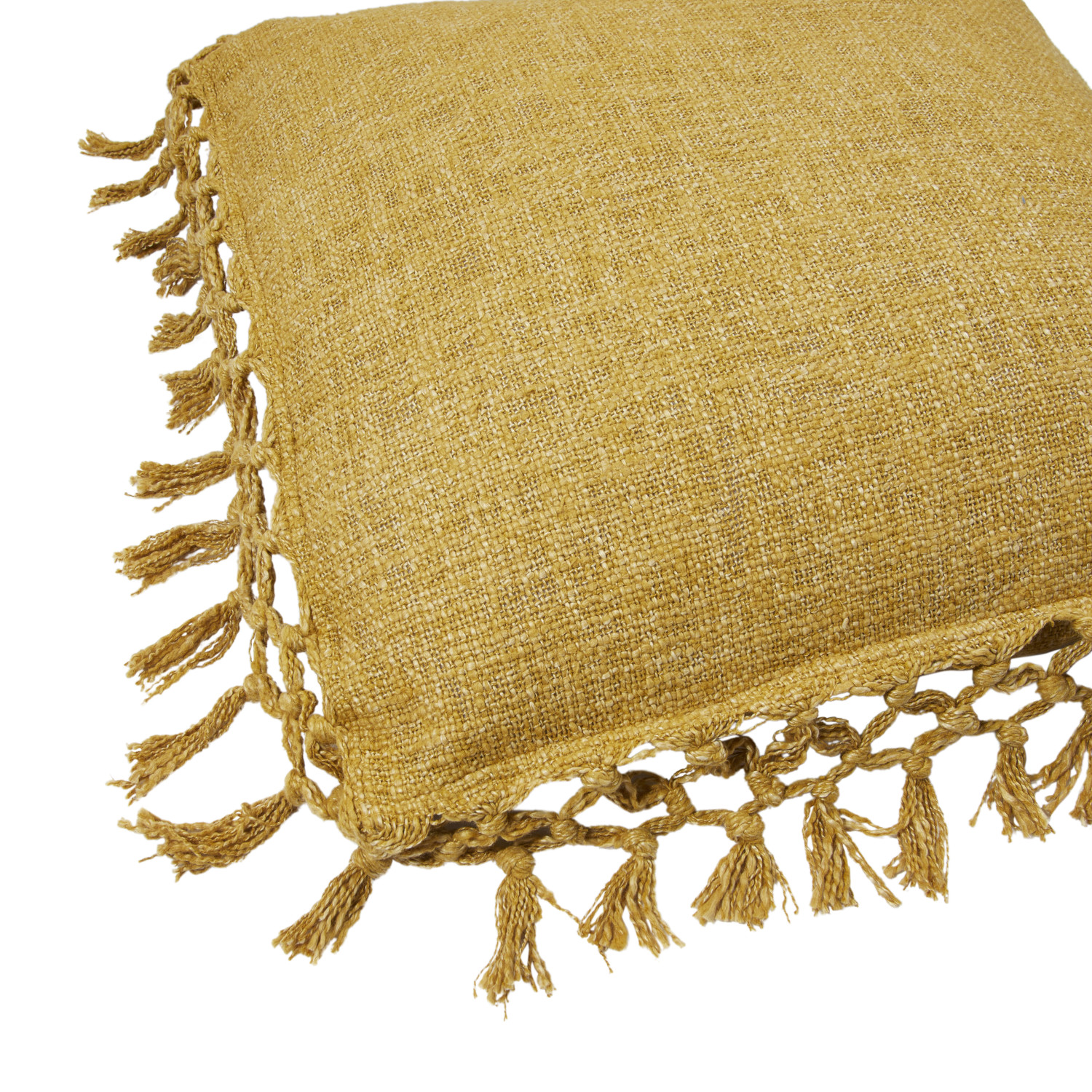 This boho-inspired throw pillow cover showcases soft cotton slub construction adorned with intricately crocheted fringe detail. Square mustard cotton slub throw pillow with crocheted fringe. Express your constantly evolving style with the simple addition of this eye-catching pillow. Removable cotton throw pillow cover with polyester insert; Hand wash, warm iron if needed.
