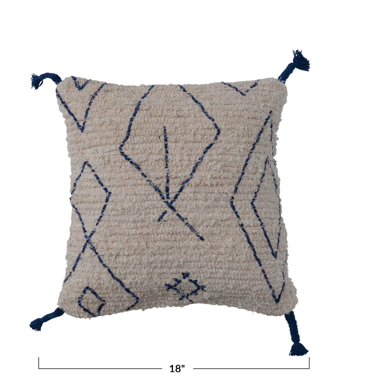 Catalog Name: 18" Square Cotton Tufted Pillow w/ Printed Moroccan Design & Braided Tassels, Natural & Blue
