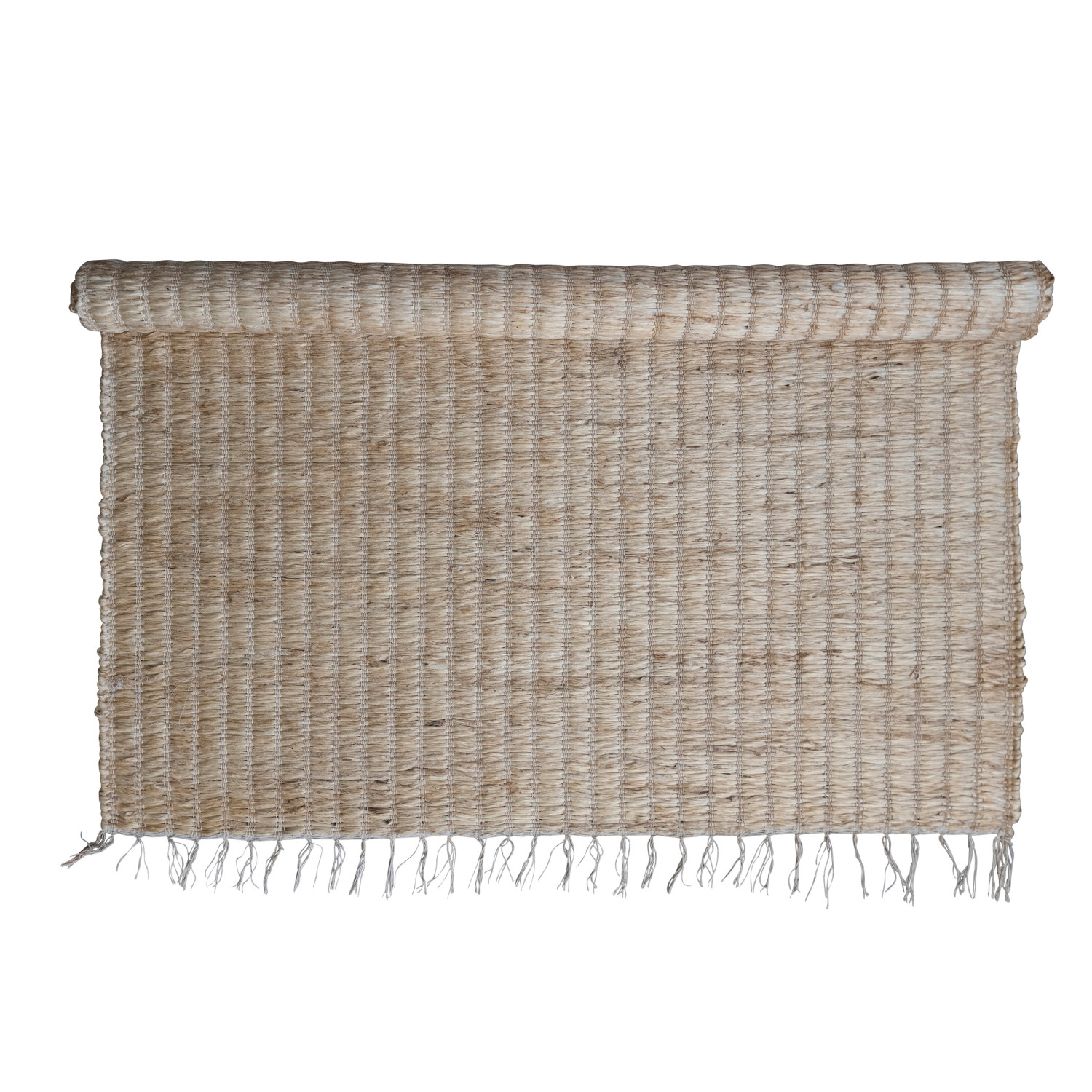 Our thoughtfully curated collection of rugs showcases a wide array of lush woven textures, prints, embroidery, and silhouettes to instantly transform any space. Explore a wide variety of pieces to bring warmth to any space including doormats, patchwork, dhurrie rugs, circle rugs, tufted area rugs, floor runner rugs, and so much more. Choose from vast selection of materials from pieced leather and jute to handwoven cotton and wool, and styles from mid-century modern and global to contemporary boho and traditional farmhouse. Effortlessly bring depth, warmth, and texture to a living space with a thoughtfully placed rug that is sure to impress. This minimalist floor rug features woven bleached jute and cotton adorned with decorative fringe. Display in a living or dining space of any style from farmhouse to Scandinavian. Spot Clean Only. Made from jute and cotton.