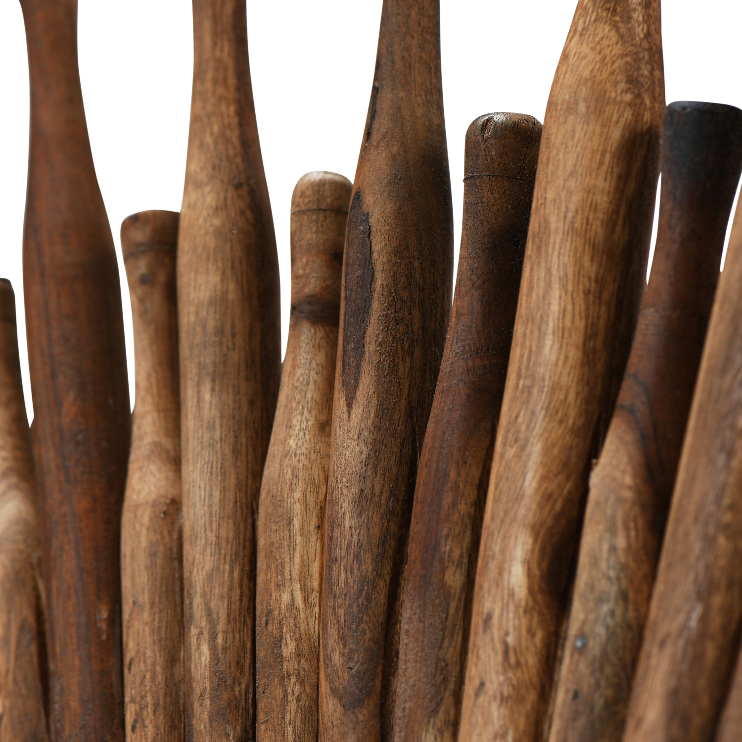 Individual wood pieces create the frame of this mirror. There are short wood pegs with longer pegs surrounding each of the smaller ones. The wood has a variety of shades and shadows making an amazing decorator piece.